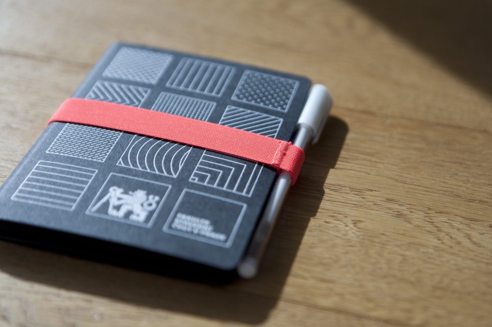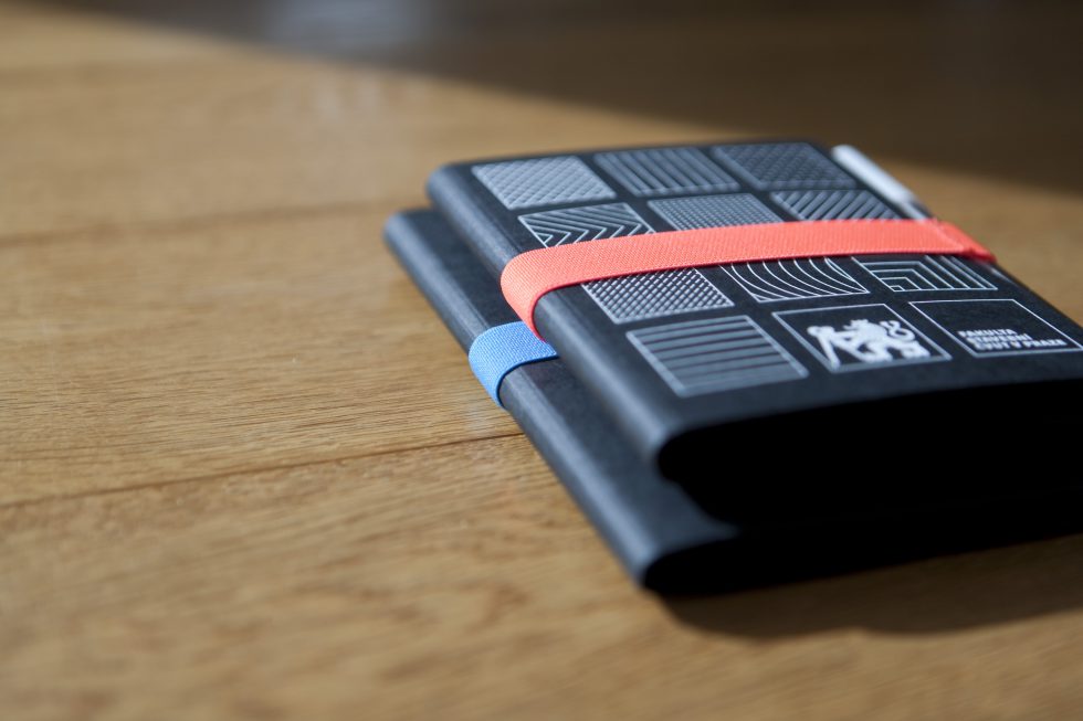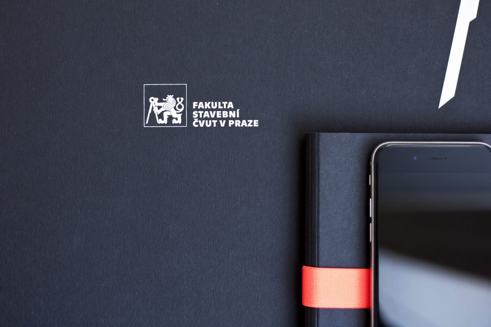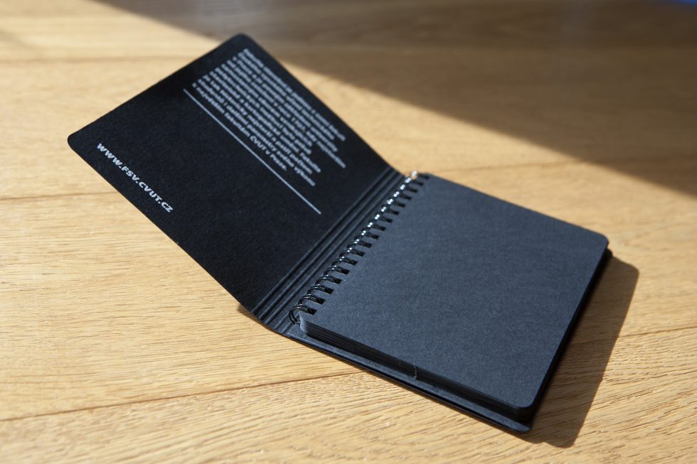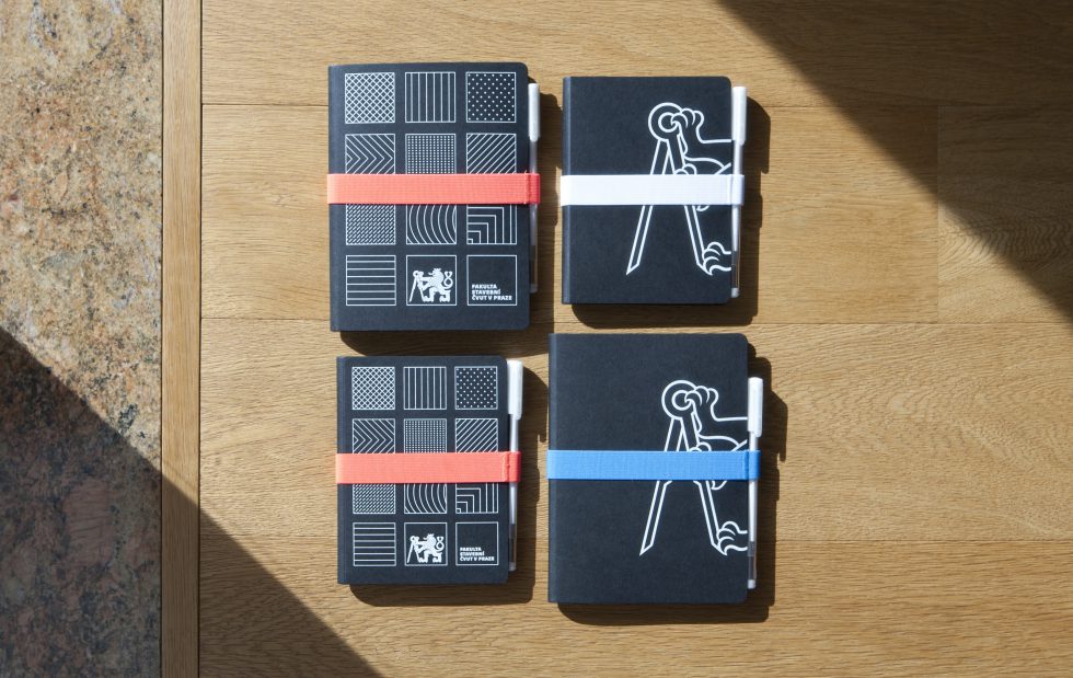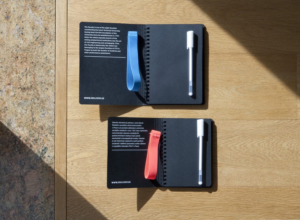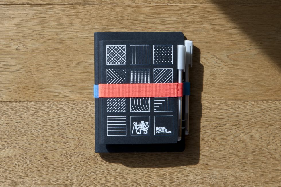 Černé zápisníky pro Fakultu stavební ČVUT. Marketingové oddělení školy přišlo s jasnou představou černých zápisníků se skrytou twin Wire vazbou, přetažených pruženkou s očkem na tužku. Grafické návrhy potisku dodal klient.