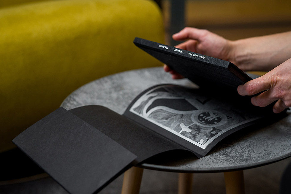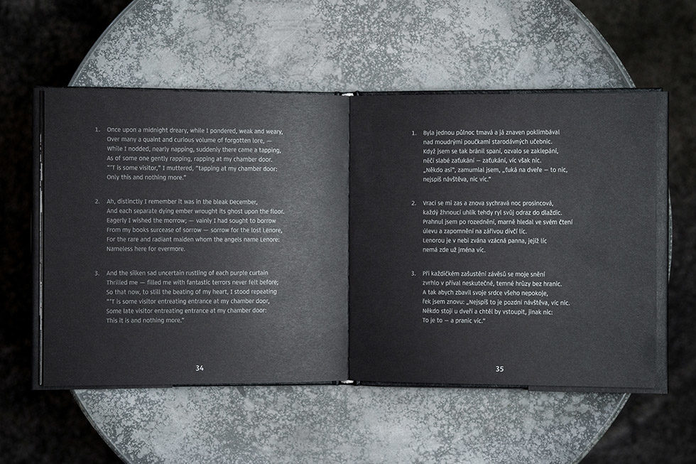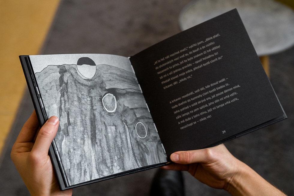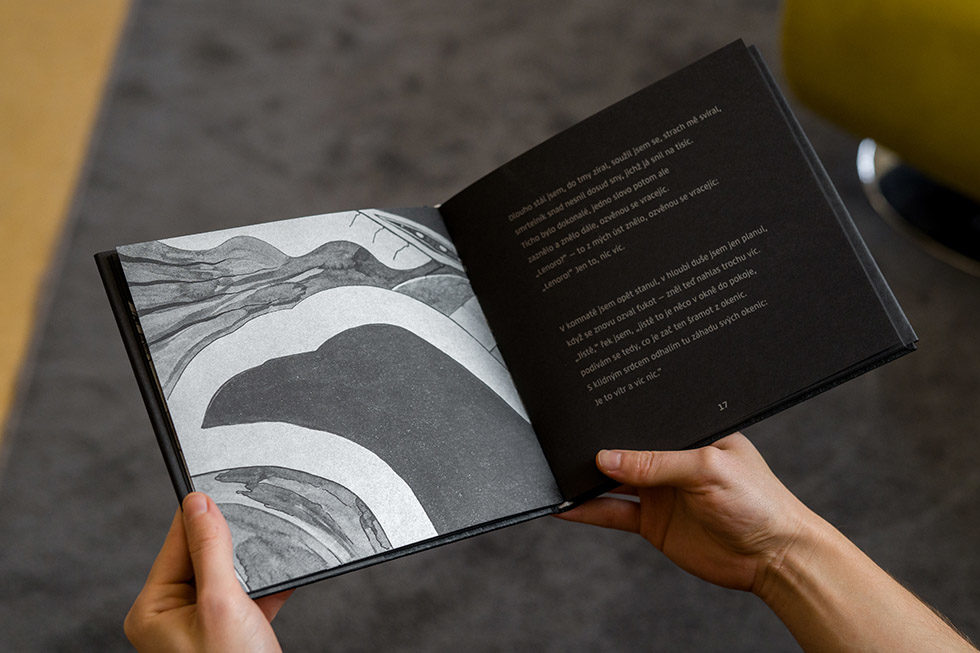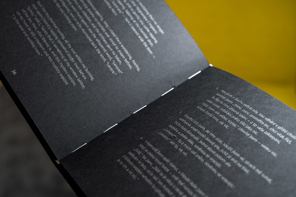 Celková koncepce druhého vydání knihy. Výroba na hranici experimentu. Pouze černý papír Pergraphica Infinite Black a tisk duplexem stříbrnou barvou. Sazba písmem Lipa Agate. Potah Twist Black a ražba stříbrnou horkou fólií.